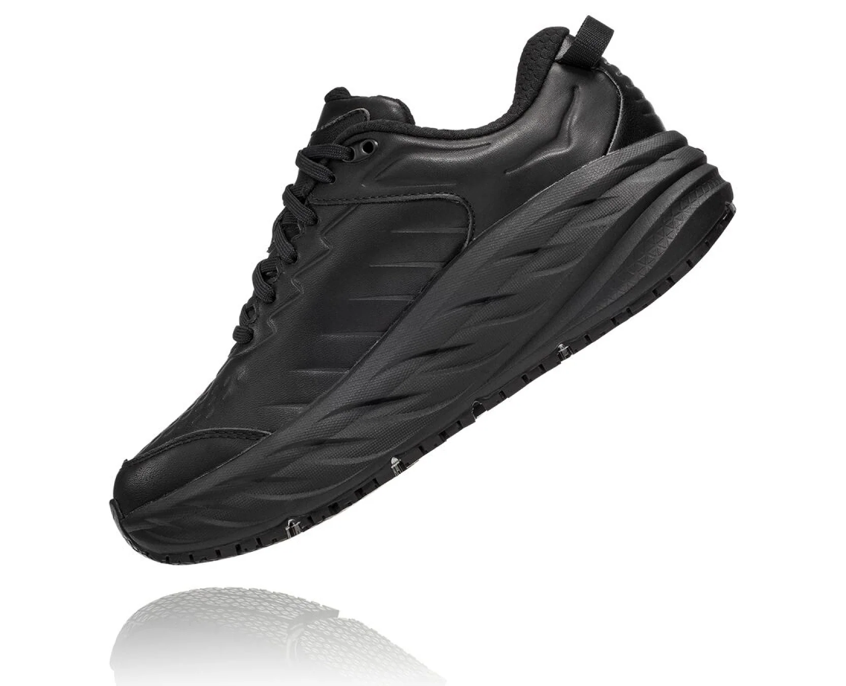 One of the first line extensions of the beloved Bondi family, the new Bondi SR takes the most cushioned shoe in the HOKA road-shoe lineup and reworks the silhouette to handle the demands of daily life. Engineered with an EVA midsole for plush, all-day cushioning, this workplace warrior has been updated with water-resistant leather and a slip-resistant outsole. Boasting a proprietary outsole compound tested against industry standards, the Bondi SR features an ultra-grippy, full ground contact rubber that stands up to the service industry and medical field alike.FEATURES